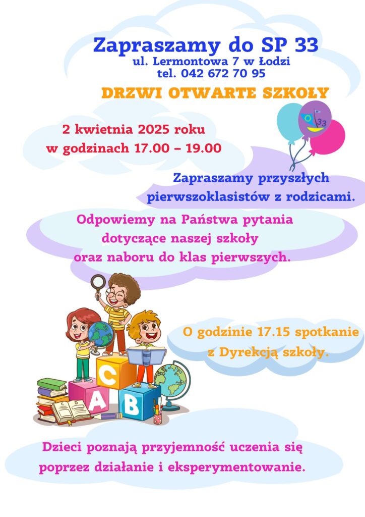 Serdecznie zapraszamy Państwa wraz z przyszłymi pierwszoklasistami na pełen niespodzianek Dzień Otwarty Szkoły, który odbędzie się 2 kwietnia 2025 roku w godzinach 17.00 – 19.00 w Szkole Podstawowej nr 33 przy ul. Lermontowa 7 w Łodzi.