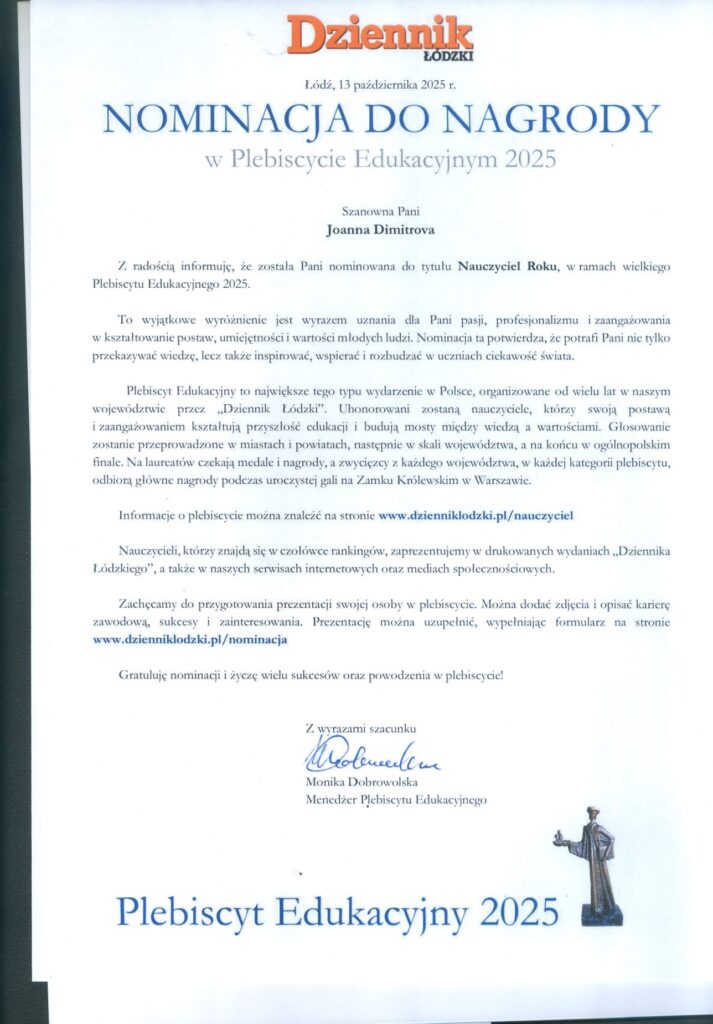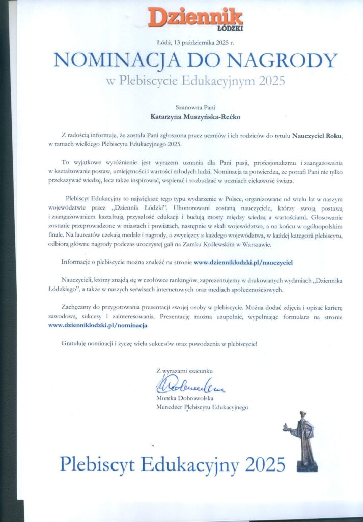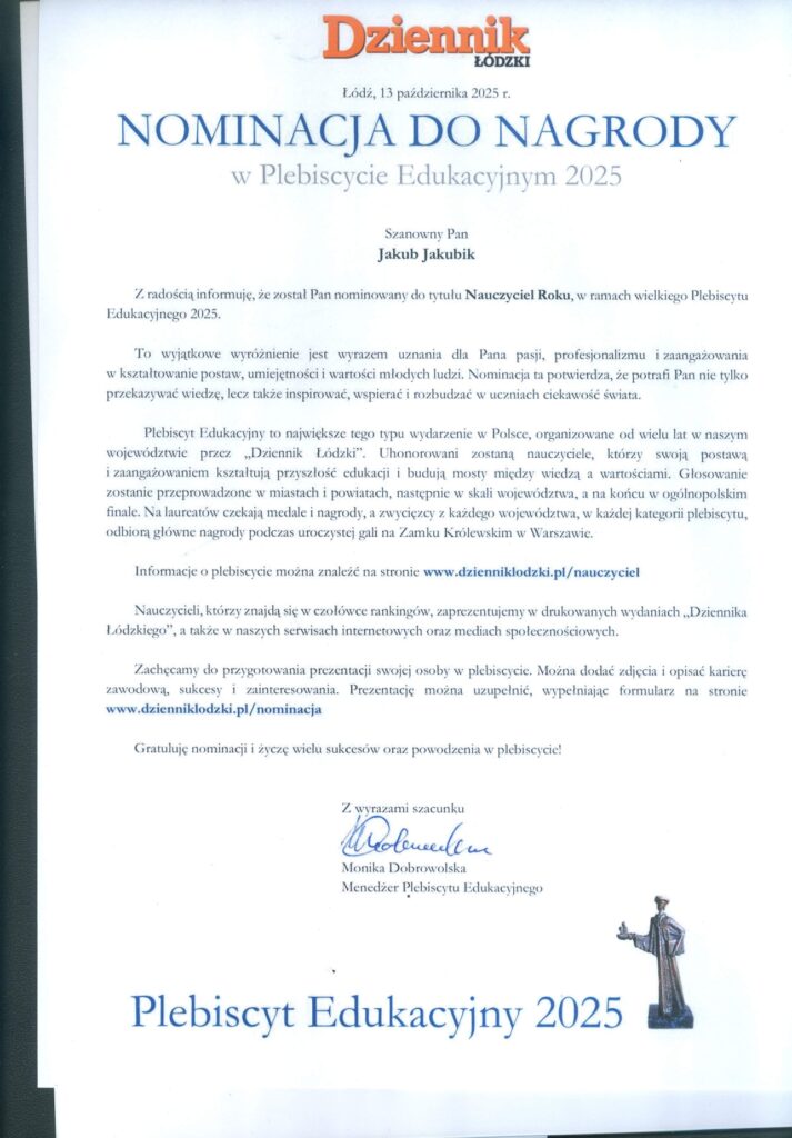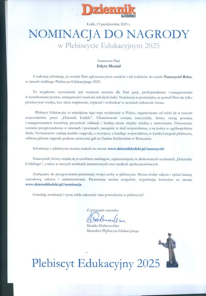 Nominację do nagrody dla najlepszych nauczycieli otrzymali: w kategorii Nauczyciel klas IV-VIII: Edyta Musiał, Jakub Jakubik, Joanna Dimitrova, Katarzyna Muszyńska-Rećko